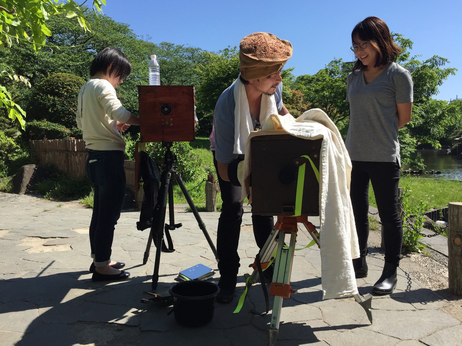 さて、撮影方法をプロジェクターで学んだあと、隅田公園で撮影です。講師のお二人が実際に撮影して見せます。ピントを合わせて、印画紙を置いて、撮影して、手をつっこんで現像液につけて、覗き穴から様子を伺って定着液につけて、まずネガができあがります。次に、ネガを箱の前にセットして撮影。ピントを合わせて~(以下、上記と同じなので省略)さあ完成!